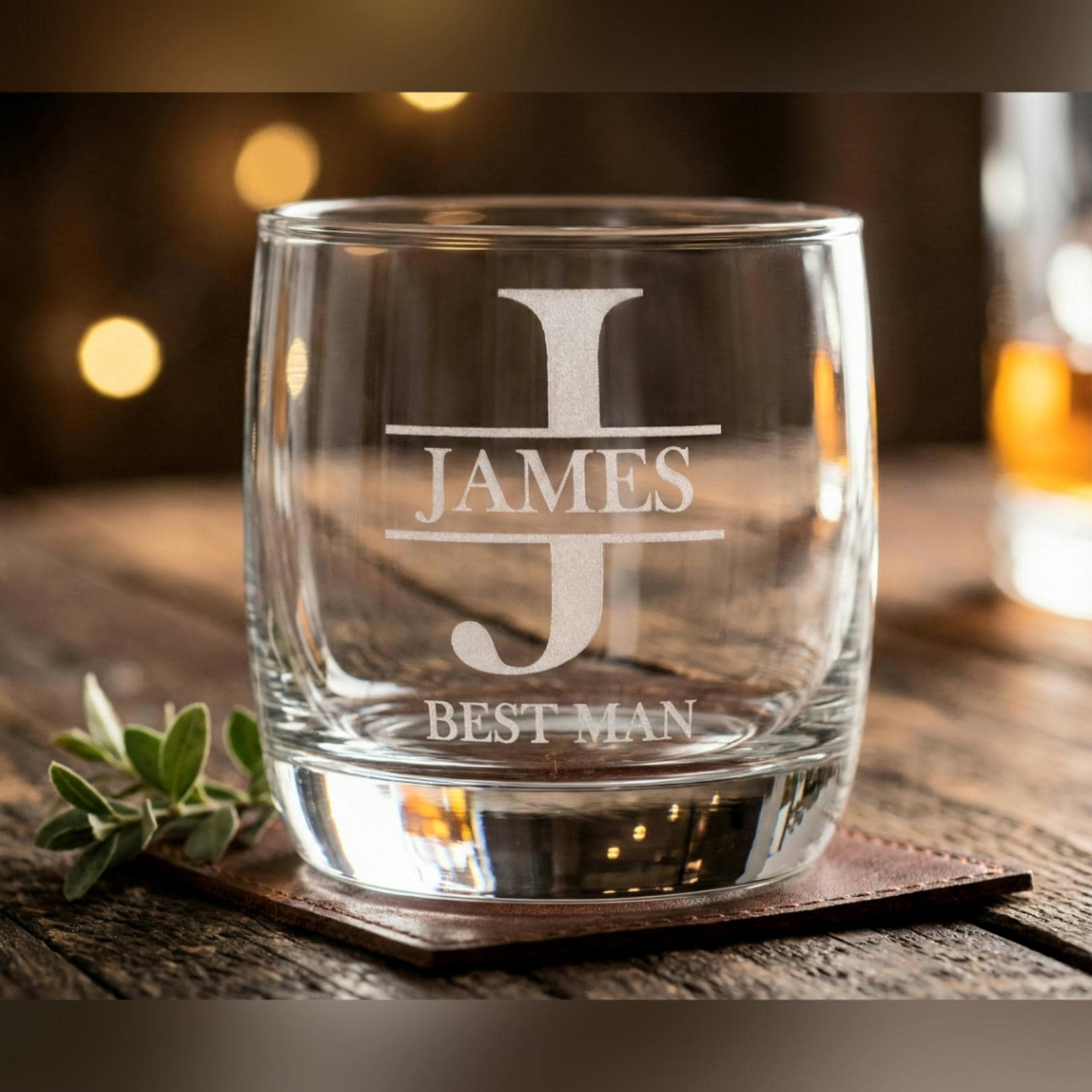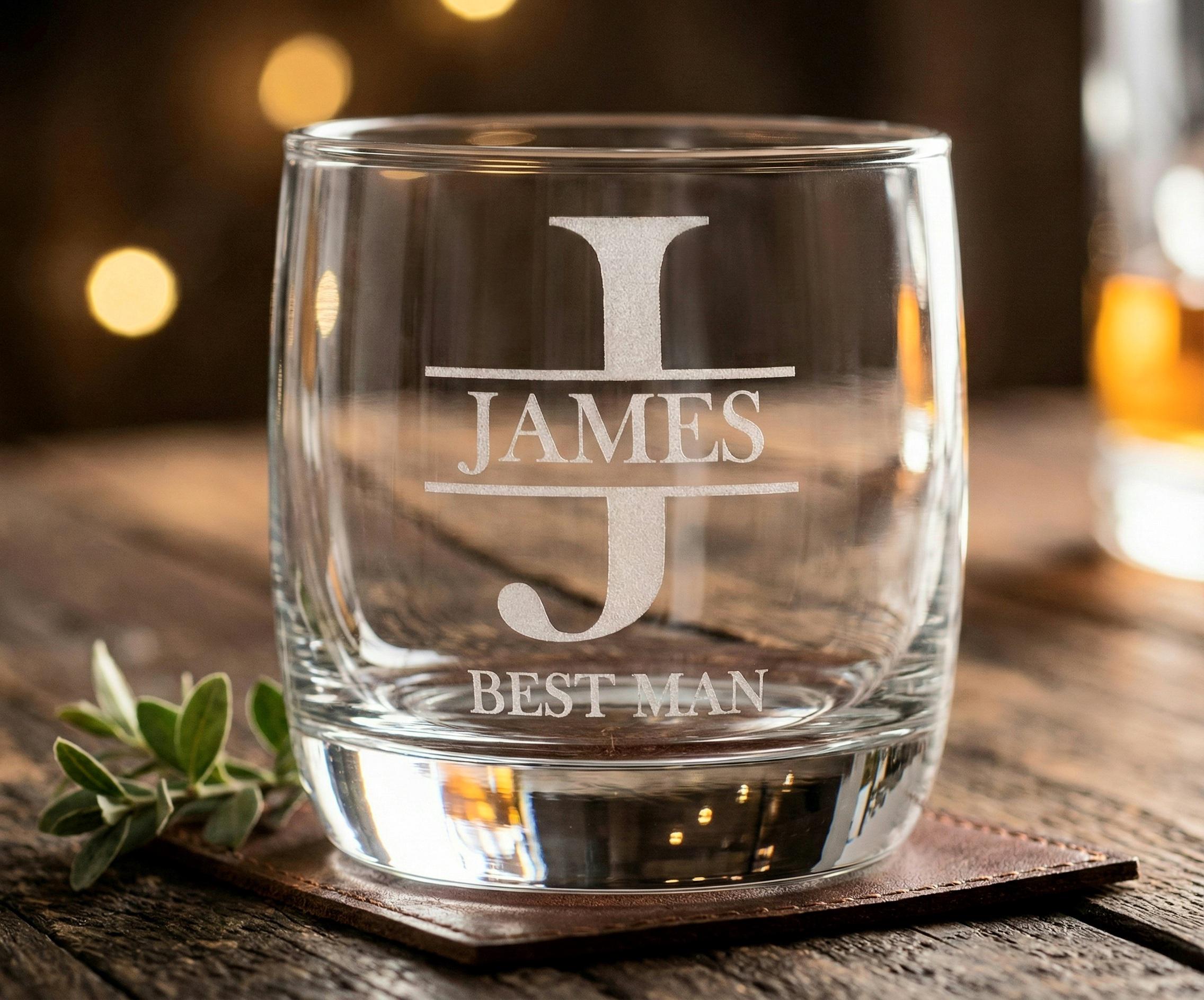 Give your Best Man and Groomsmen a gift they will actually use long after the wedding reception ends. This custom etched whiskey glass features a sophisticated split-letter monogram design, personalized with their name and wedding role.